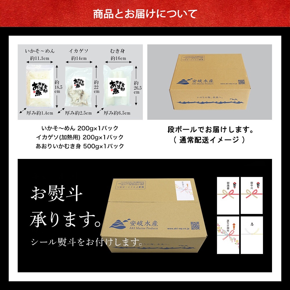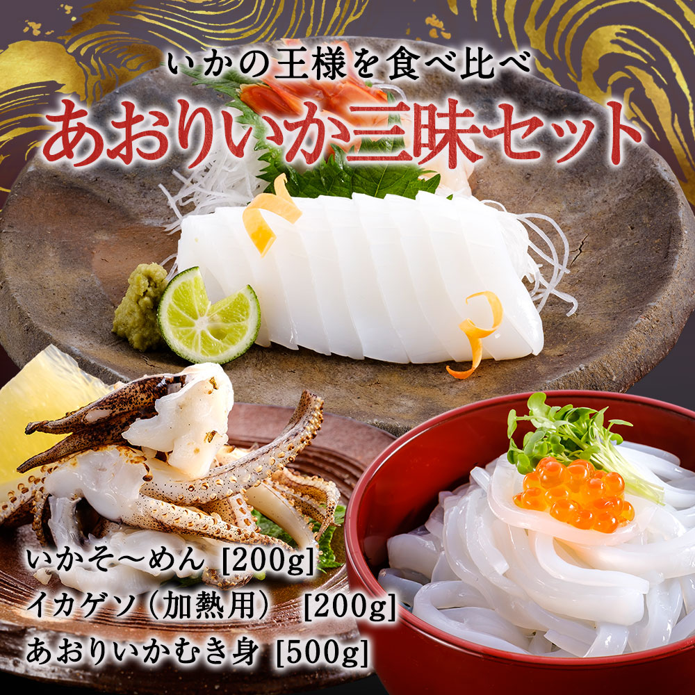 | 名称 | あおりいか 三昧セット(むき身500g、ゲソ200g、いかそ~めん200g) |