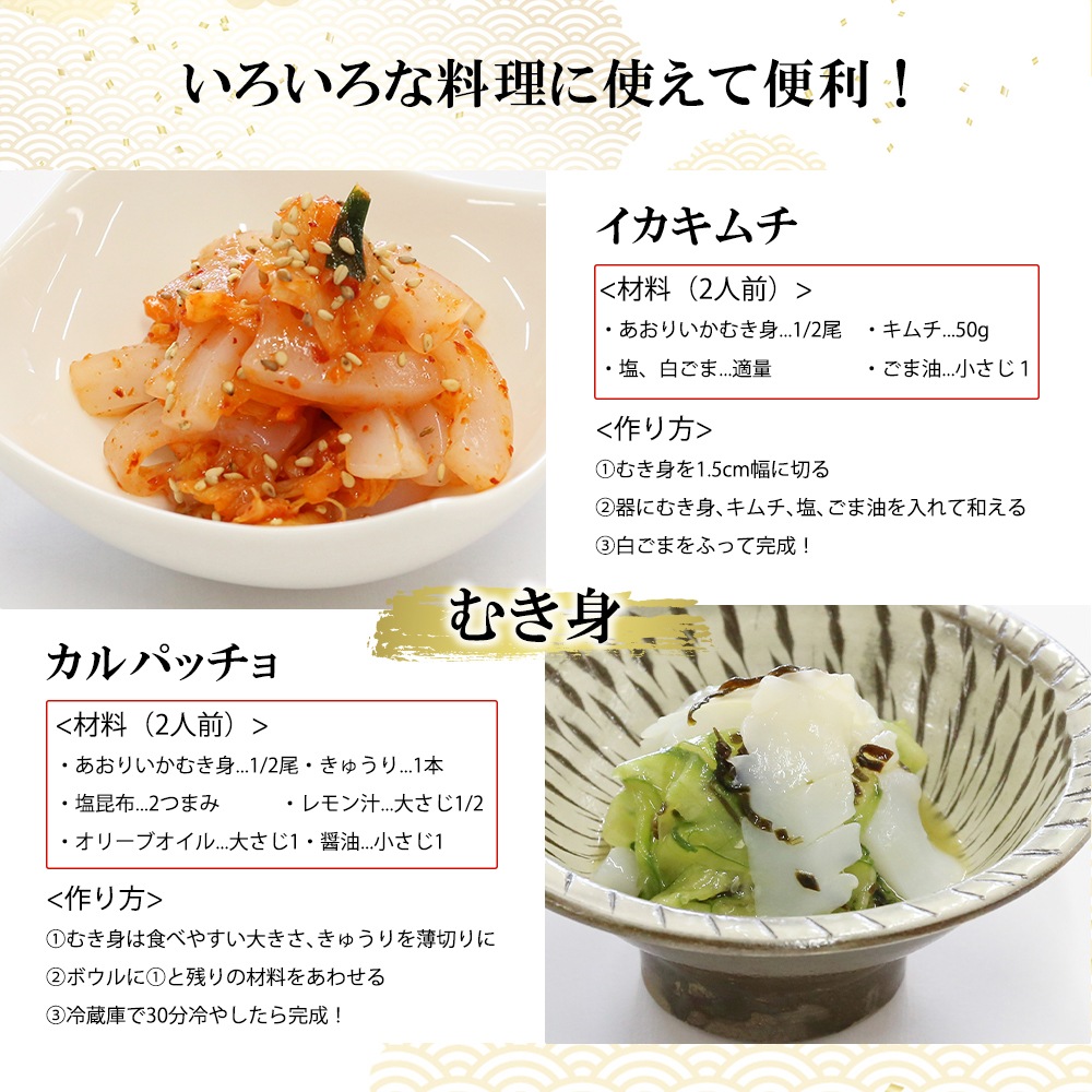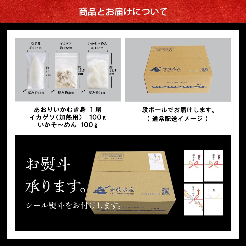 | 名称 | 期間限定 あおりいかセット(むき身1尾、ゲソ100g、いかそ~めん100g) |