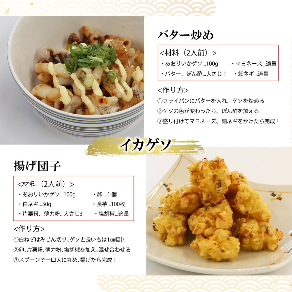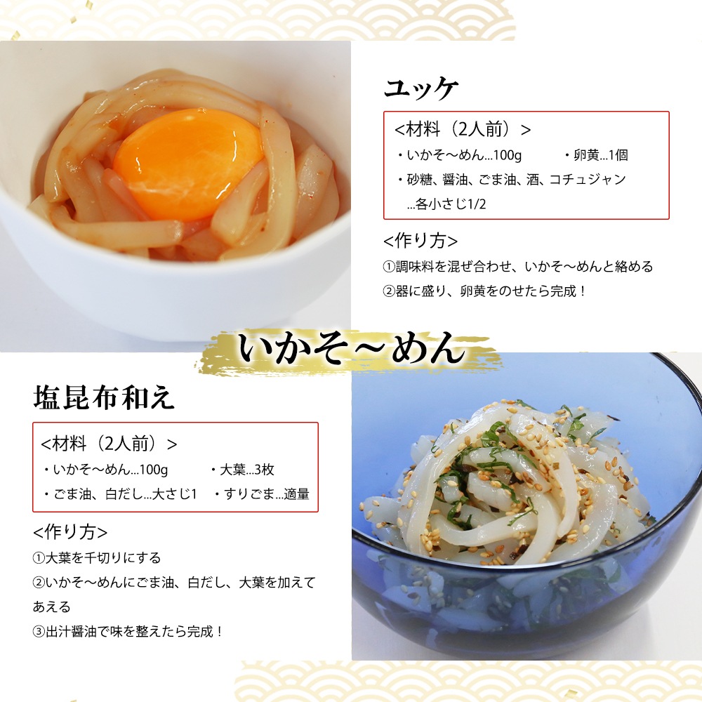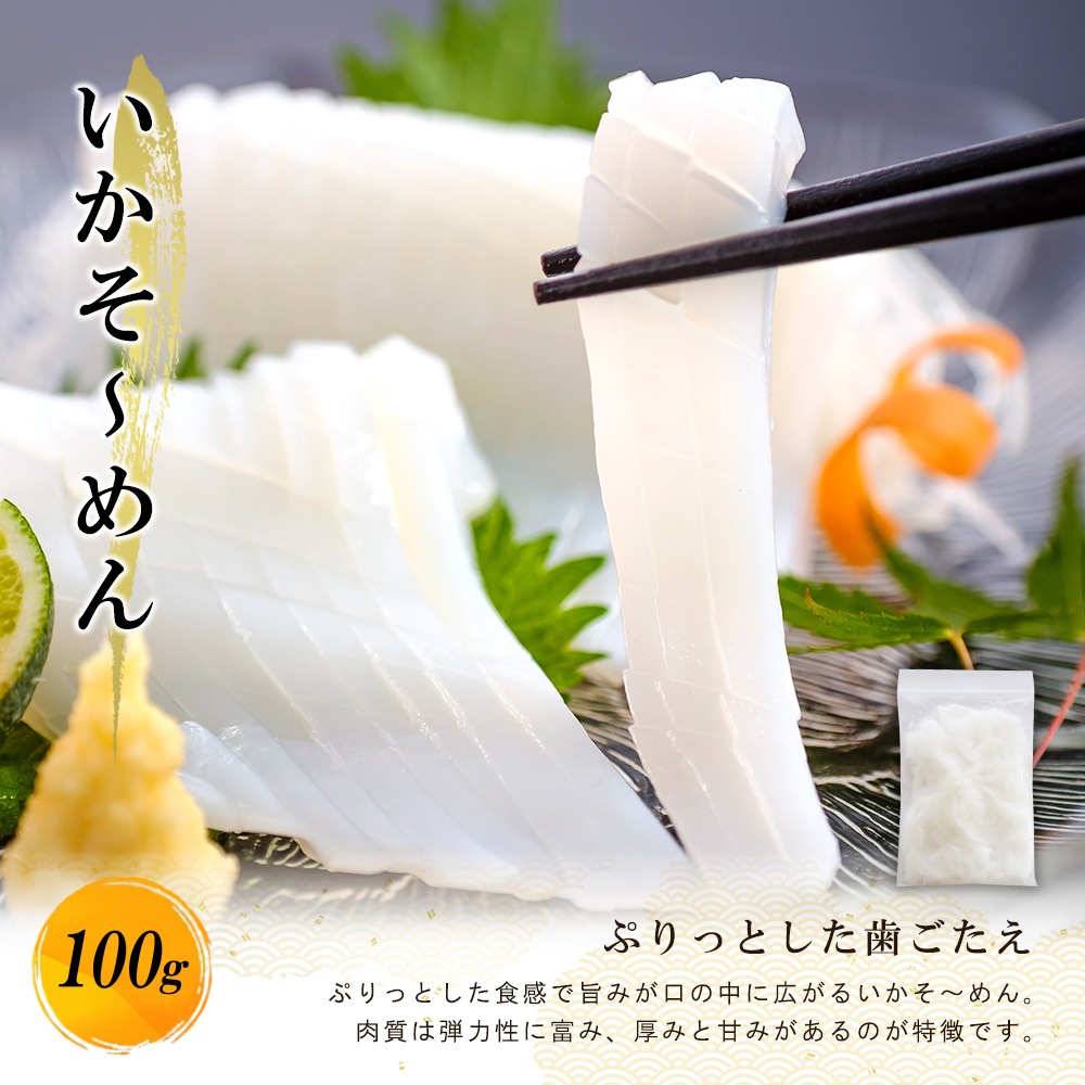 | 内容量1 | むき身1尾、ゲソ100g、いかそ~めん100g |