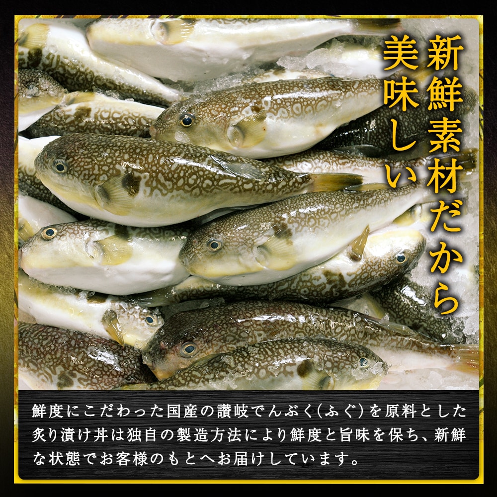 | 原材料名1 | 標準和名ナシフグ(漁獲水域瀬戸内海香川県)、醤油、発酵調味料、ごま、砂糖、粉末調味料(澱粉、糖類(粉末水飴)、発酵調味料)、(一部に小麦・大豆・ごまを含む) |