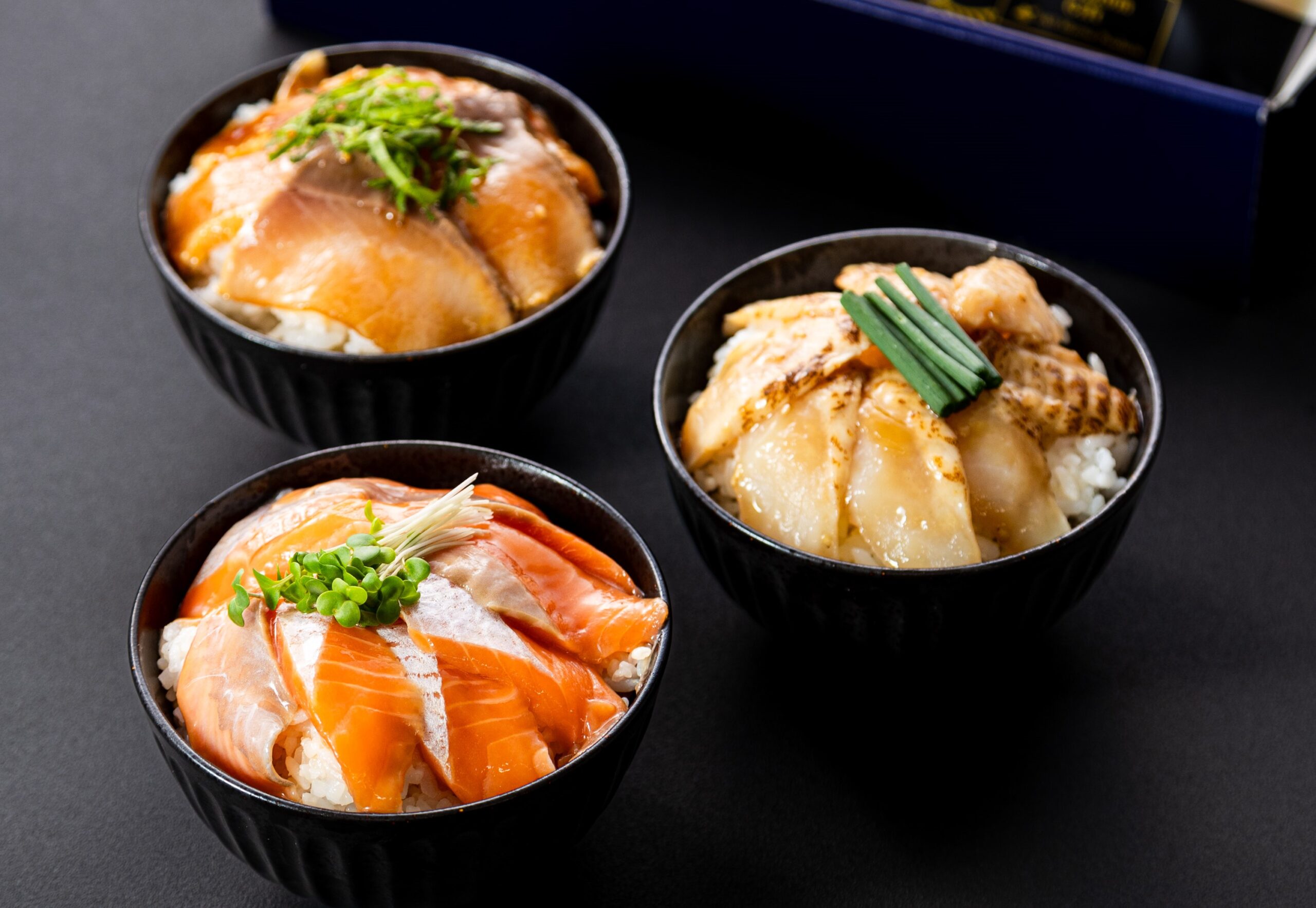オリーブサーモン漬け丼、讃岐でんぶくの炙り漬け丼(フグ)、ぶりの炙り漬け丼の国産のお魚を使った海鮮漬け丼の詰め合わせ。