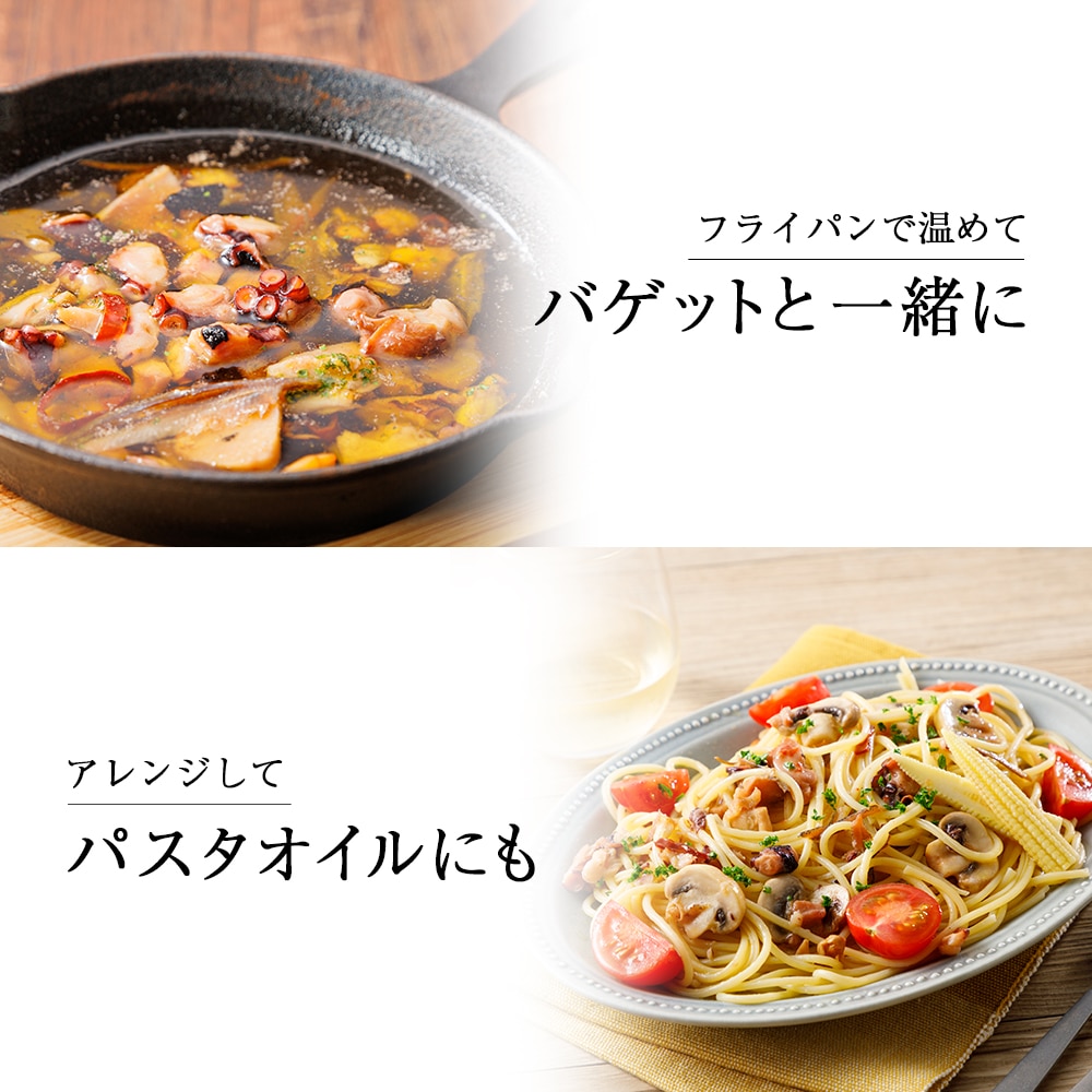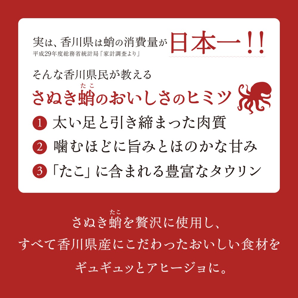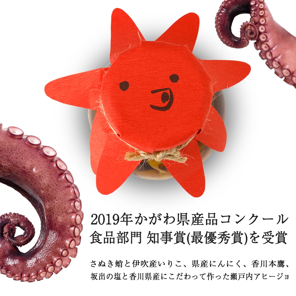 2019年かがわ県産品コンクールにて食品部門で知事賞(最優秀賞)を受賞。さぬき蛸と伊吹産いりこ、県産にんにく、香川本鷹、坂出の塩と香川県産にこだわって作った瀬戸内アヒージョは贈り物としても人気の高い商品です。